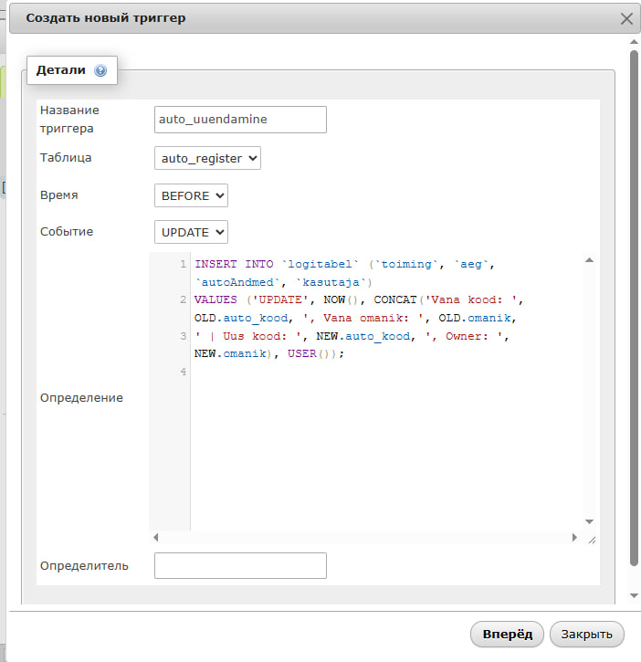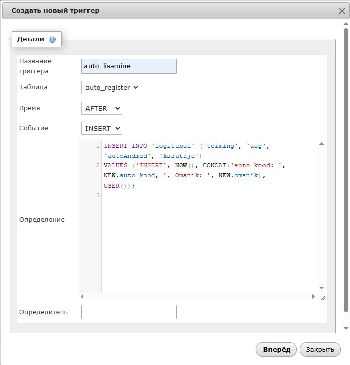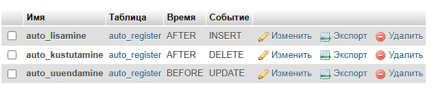 Looge päästikud andmete lisamise, kustutamise ja muutmise salvestamiseks automaatregistri tabelis, samal ajal kui muudatuste andmed salvestatakse logitabeli tabelisse.