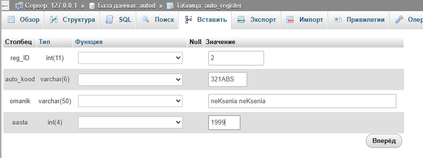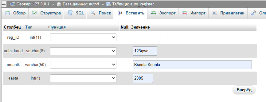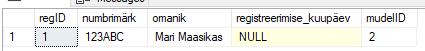 INSERT INTO autoregister (numbrimärk, omanik,registreerimise_kuupäev, mudelID)