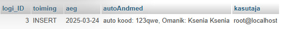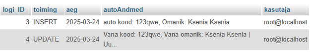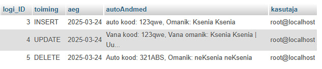 Looge logitabel(id, toiming, aeg, autoAndmed), et salvestada muudatused autoregistris.