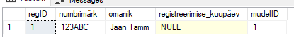 VALUES ('123ABC', 'Jaan Tamm', GETDATE(), 1);